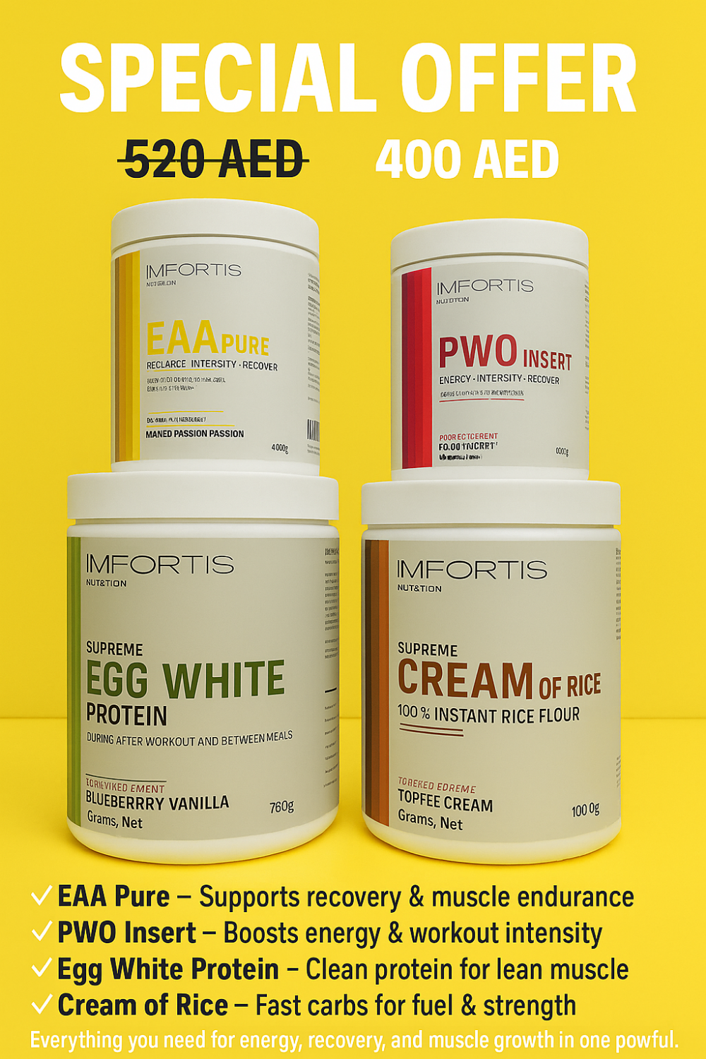 باقة دورة I'Mfortis - احصل على حبة واحدة من EAA، وحبة واحدة من PWO، وحبة واحدة من بروتين بياض البيض، وحبة واحدة من كريمة الأرز - بالإضافة إلى 3 منتجات رياضية مجانية! اختر نكهات I'Mfortis المفضلة لديك، وحجم القفاز، وحتى لون الخلاط.