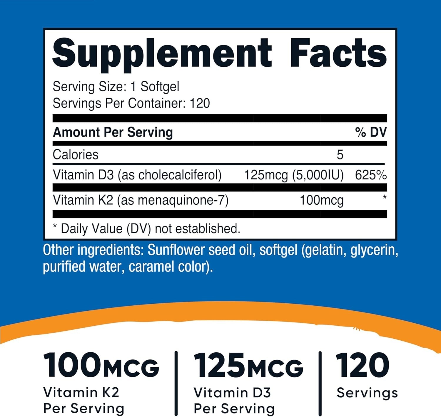 نيوتريكوست فيتامين ك2 + فيتامين د3 - ​​بدمج فيتامين ك2 وفيتامين د3، يمكنكِ الاستفادة من فوائدهما في كبسولة واحدة سهلة الاستخدام. كما يُساعد هذا المزيج على تنشيط حمض غاما لينوليك المصفوفي (Matrix GLA)، وهو بروتين يمنع تراكم الكالسيوم.