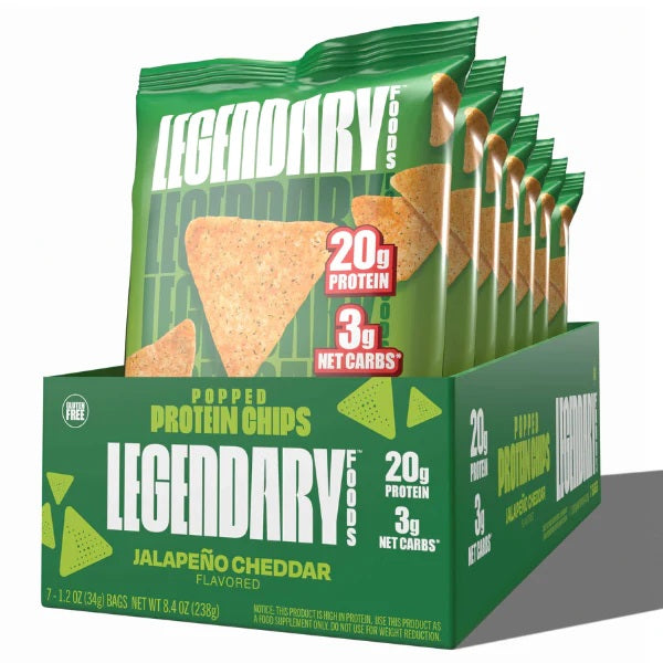 Legendary Protein Chips - a crisp, airy pop with real cheddar bite and a jalapeño kick that builds just enough to keep things interesting. These don’t nibble like diet chips; they crunch like a cheat day - only smarter. Each bag brings 20g protein with just 3g net carbs, so you get big flavor without the fallout. Add them to lunch, crush them over a salad, or own the 3pm slump.